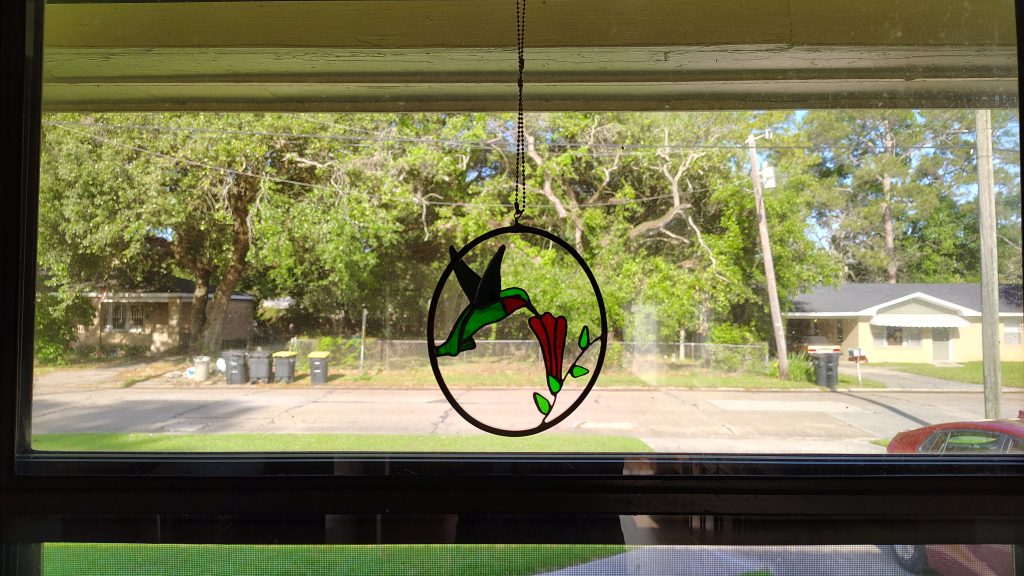 Stained glass hummingbird in my Aunt Jeannie’s kitchen window.